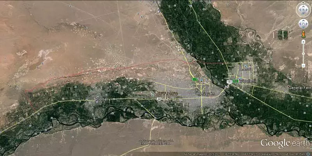 La ruta del petróleo en amarillo y la Autovía Norte cruza horizontalmente la cuidad por el oeste, son 19 km donde se encuentra el lugar de la obra.